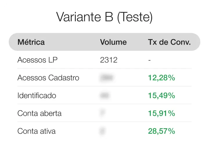 O ponto mais relevante foi no final da jornada: a nova abordagem resultou na ativação de contas que não haviam ocorrido na versão anterior, com uma taxa de conversão superior a 28% entre os usuários mais qualificados — evidenciando não só maior volume, mas maior qualidade de leads.