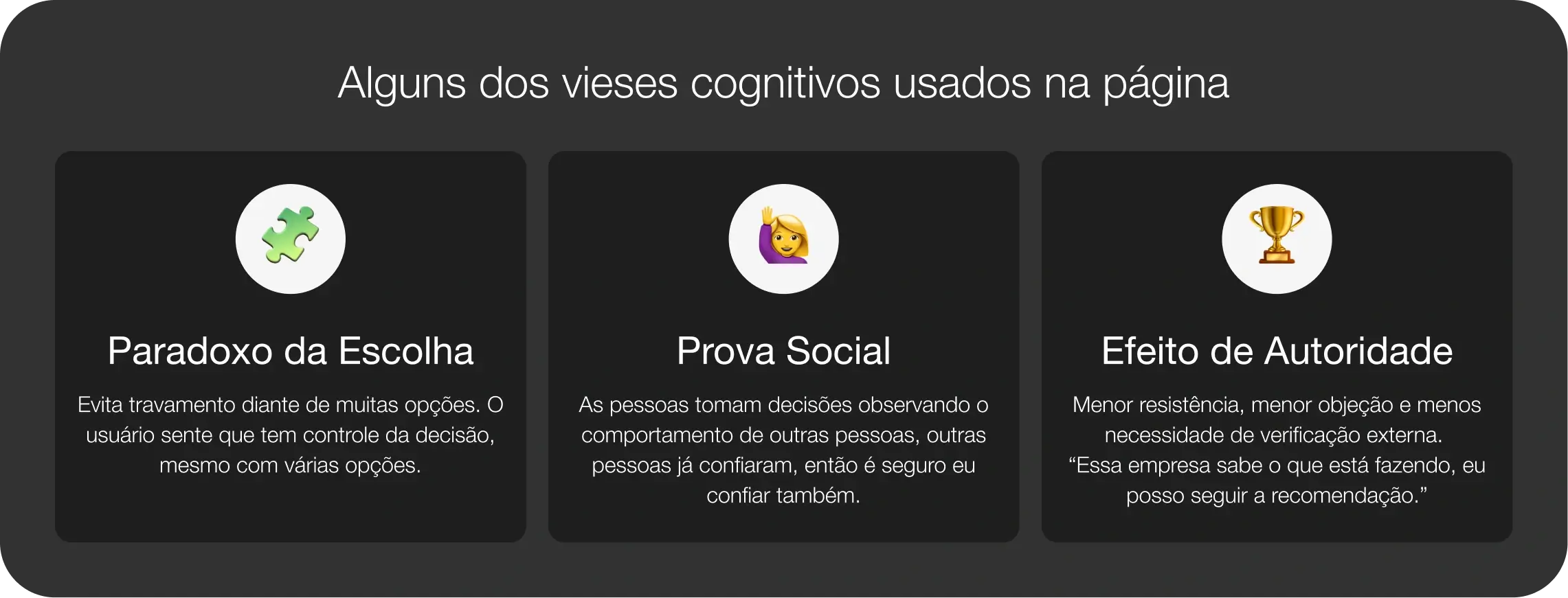 O resultado é uma estrutura que reduz a ansiedade da escolha, organiza decisões complexas, aumenta a segurança do usuário e cria um caminho claro até a ação.