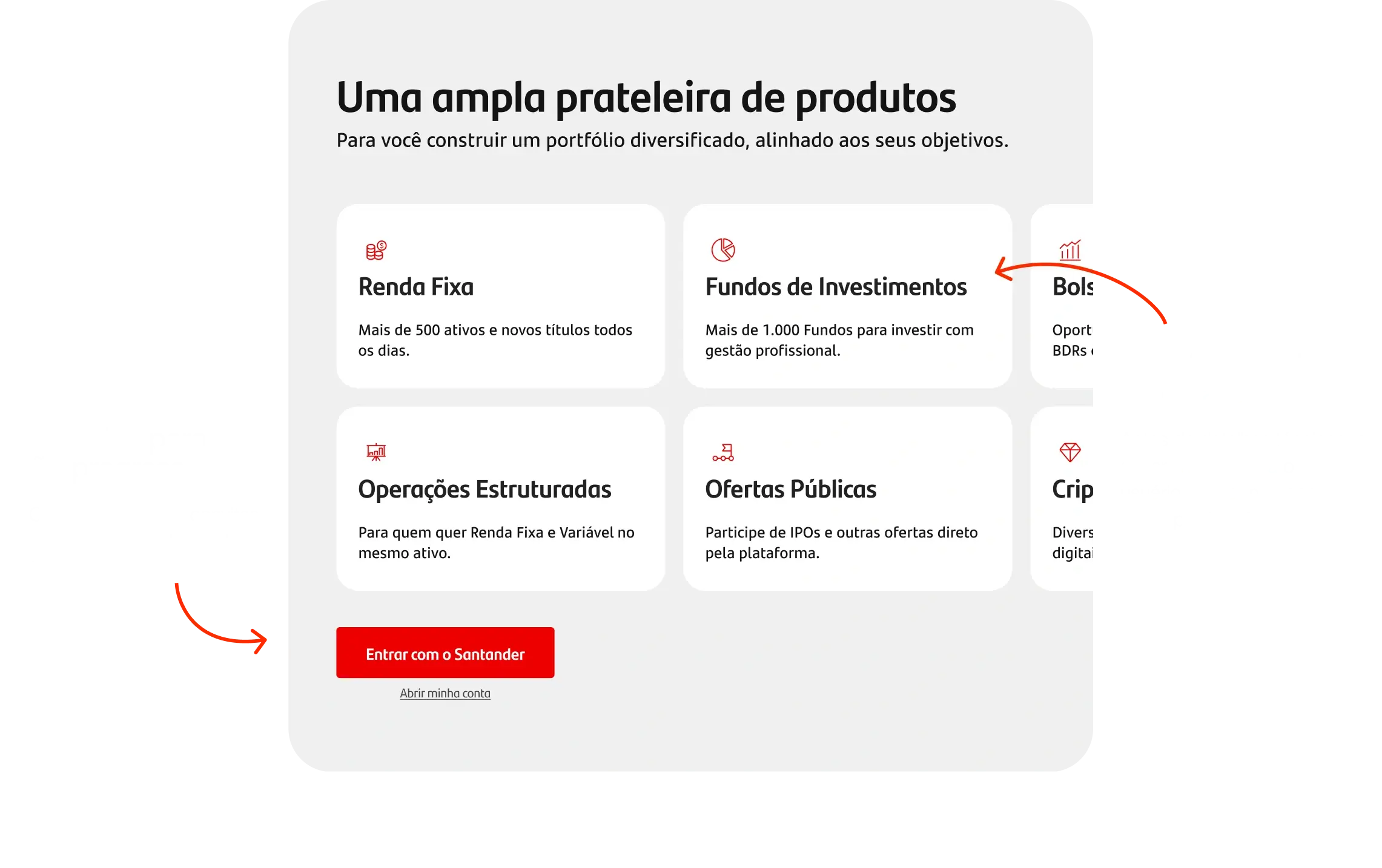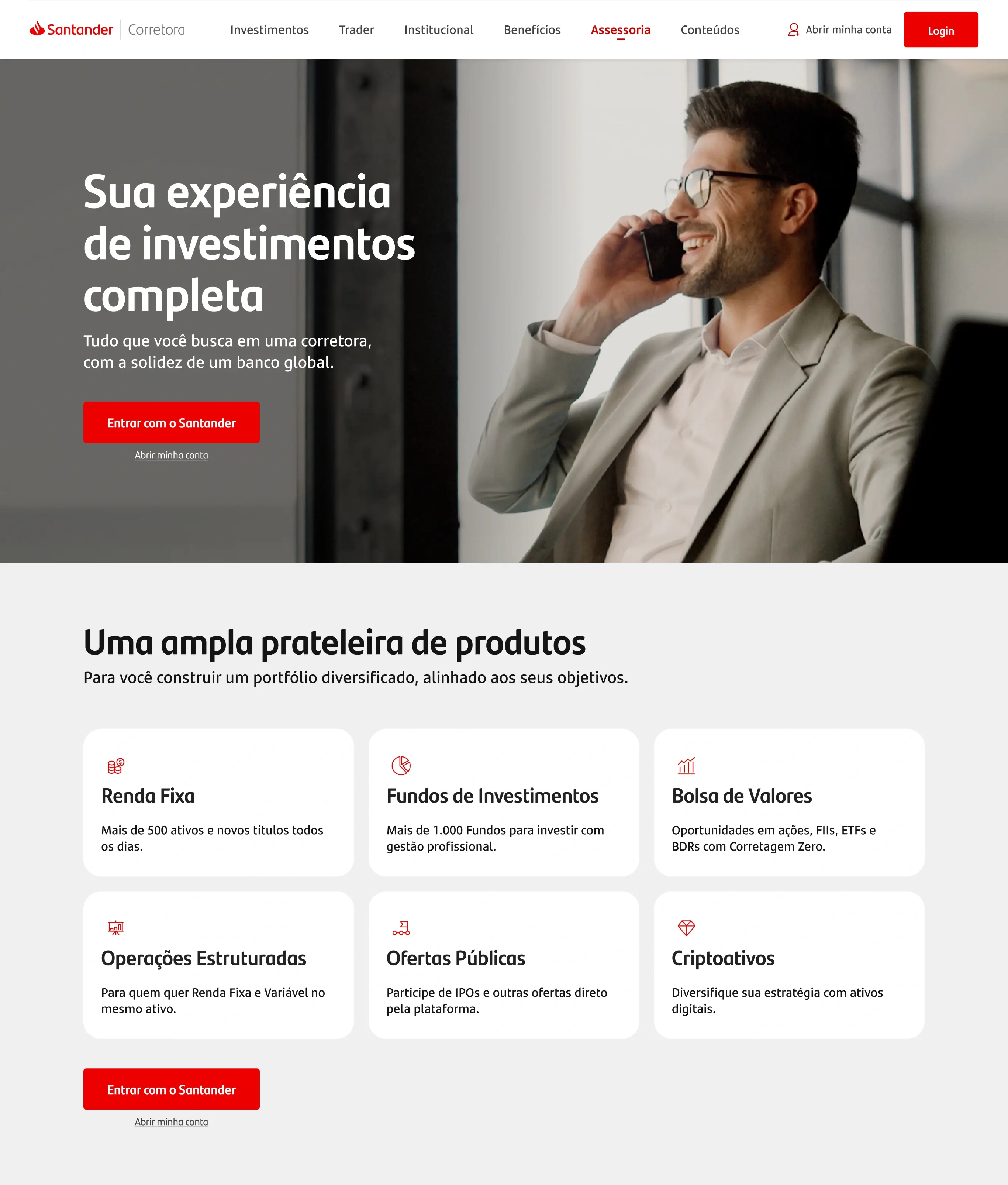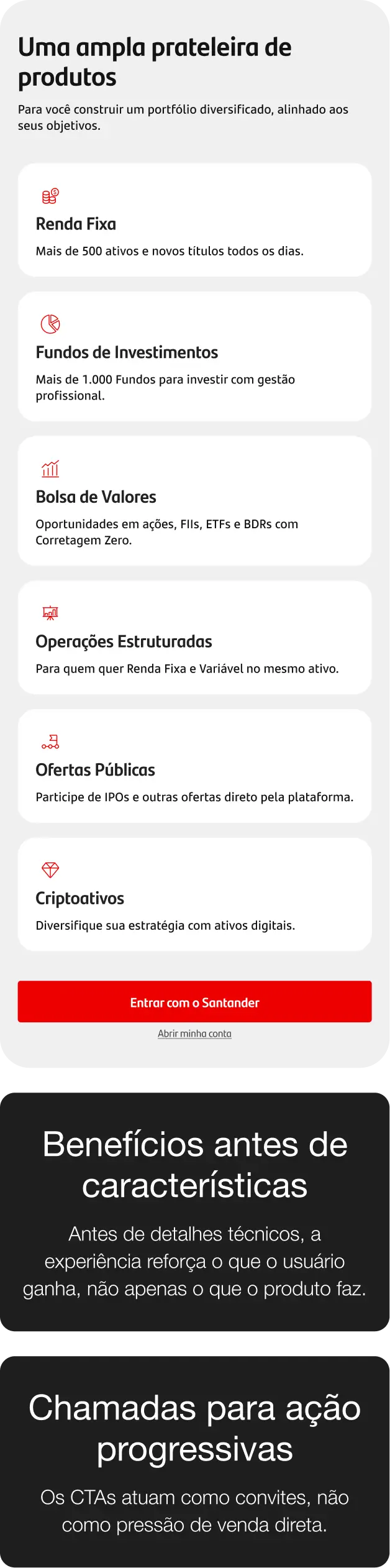 O desafio estava em apresentar uma prateleira ampla de produtos financeiros, com públicos, níveis de conhecimento e objetivos completamente diferentes, tudo isso em uma única experiência.